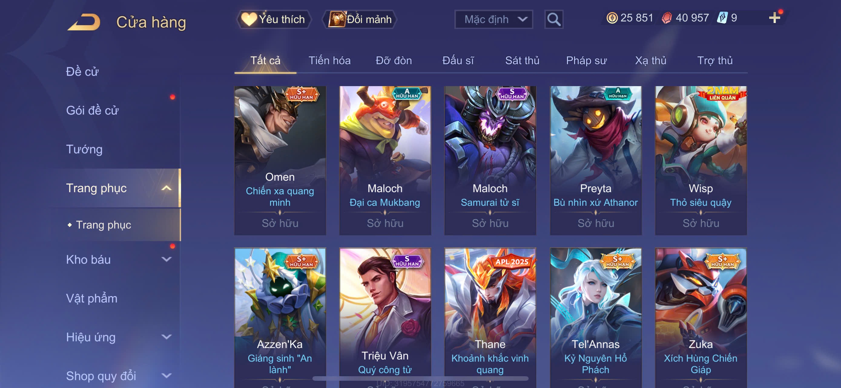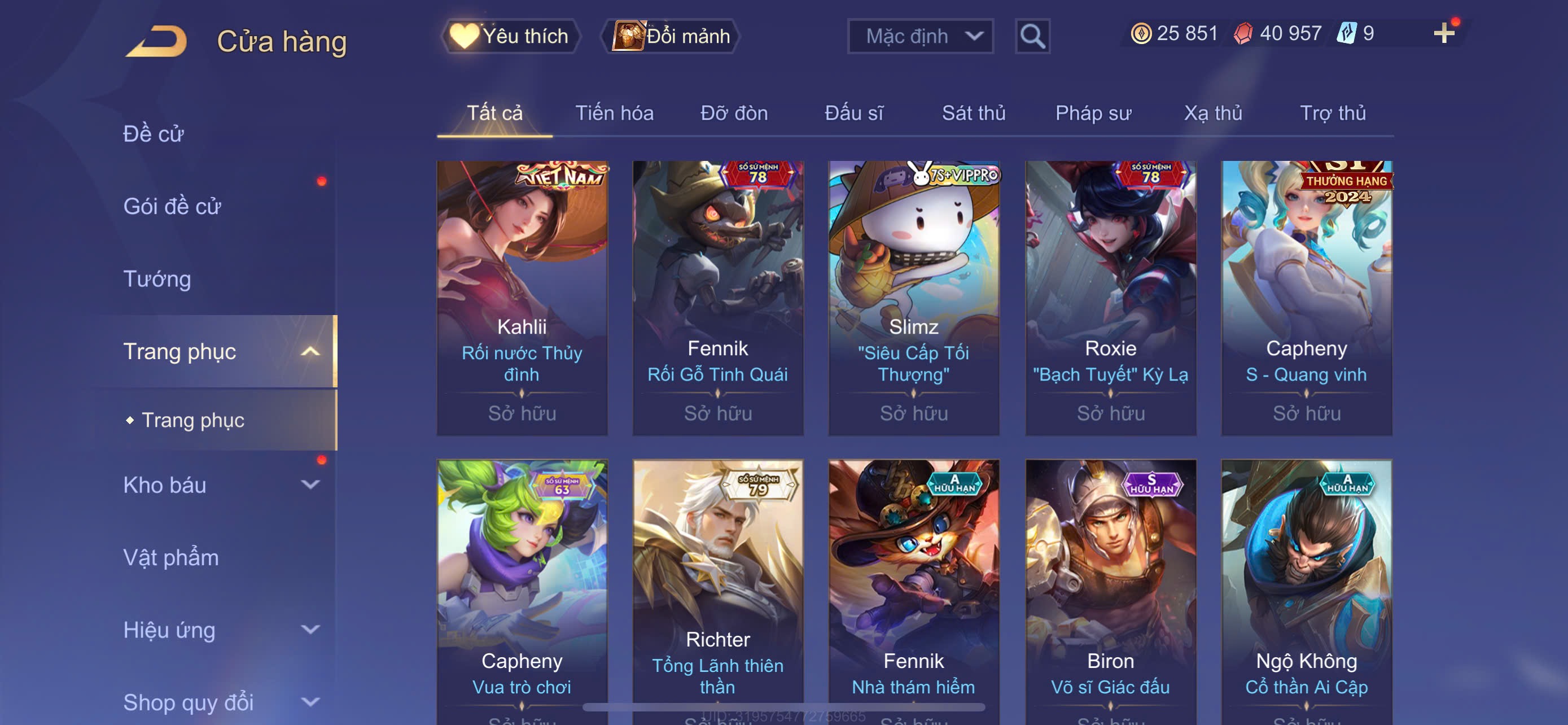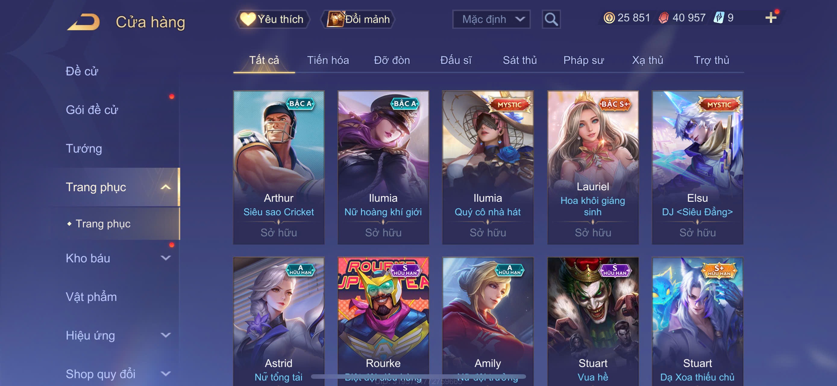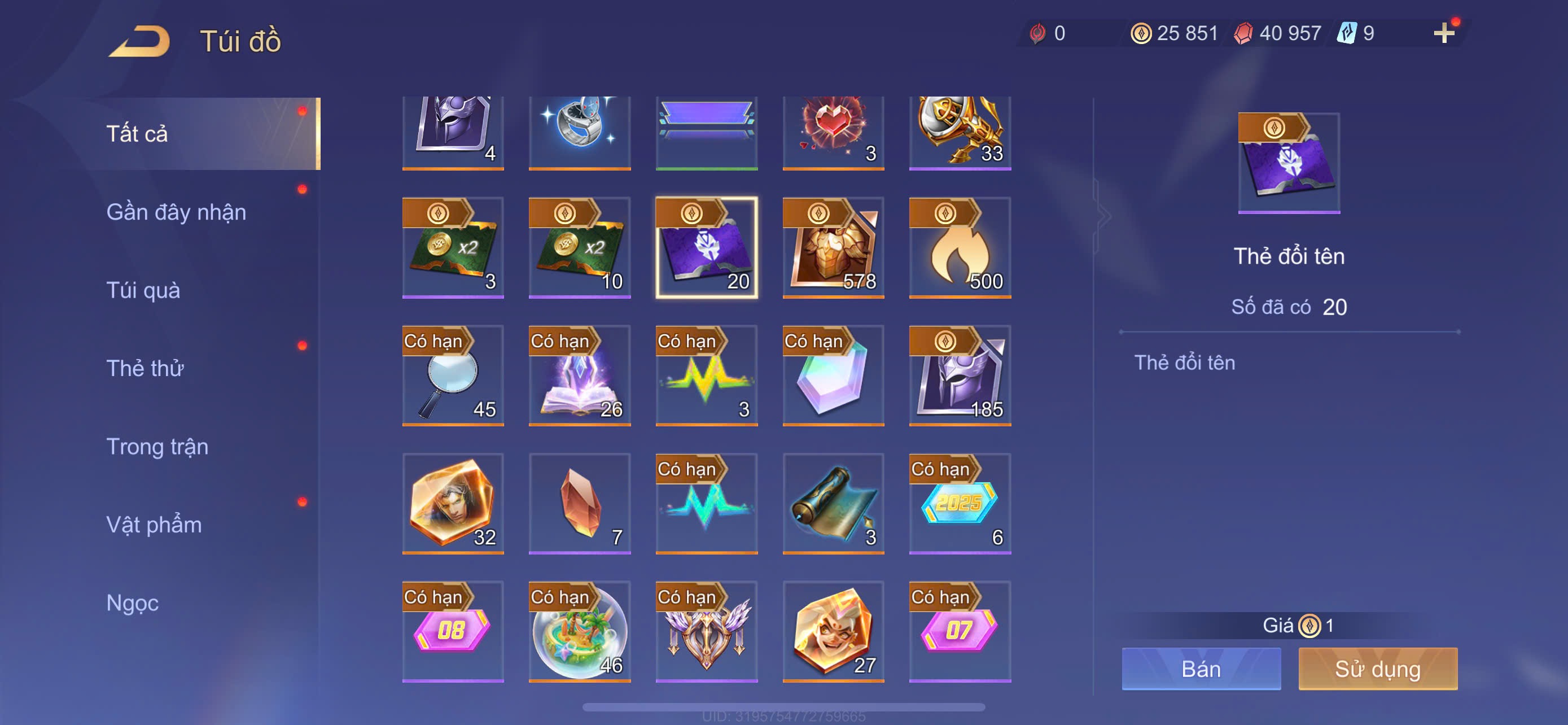 bật: rất nhiều skin sổ sứ mệnh , combo omen hắc ám quang minh , roui thanh long , tell hổ phách . dư 20 thẻ đổi tên . Nói chung là Rất nhiều skin bậc S Xịn