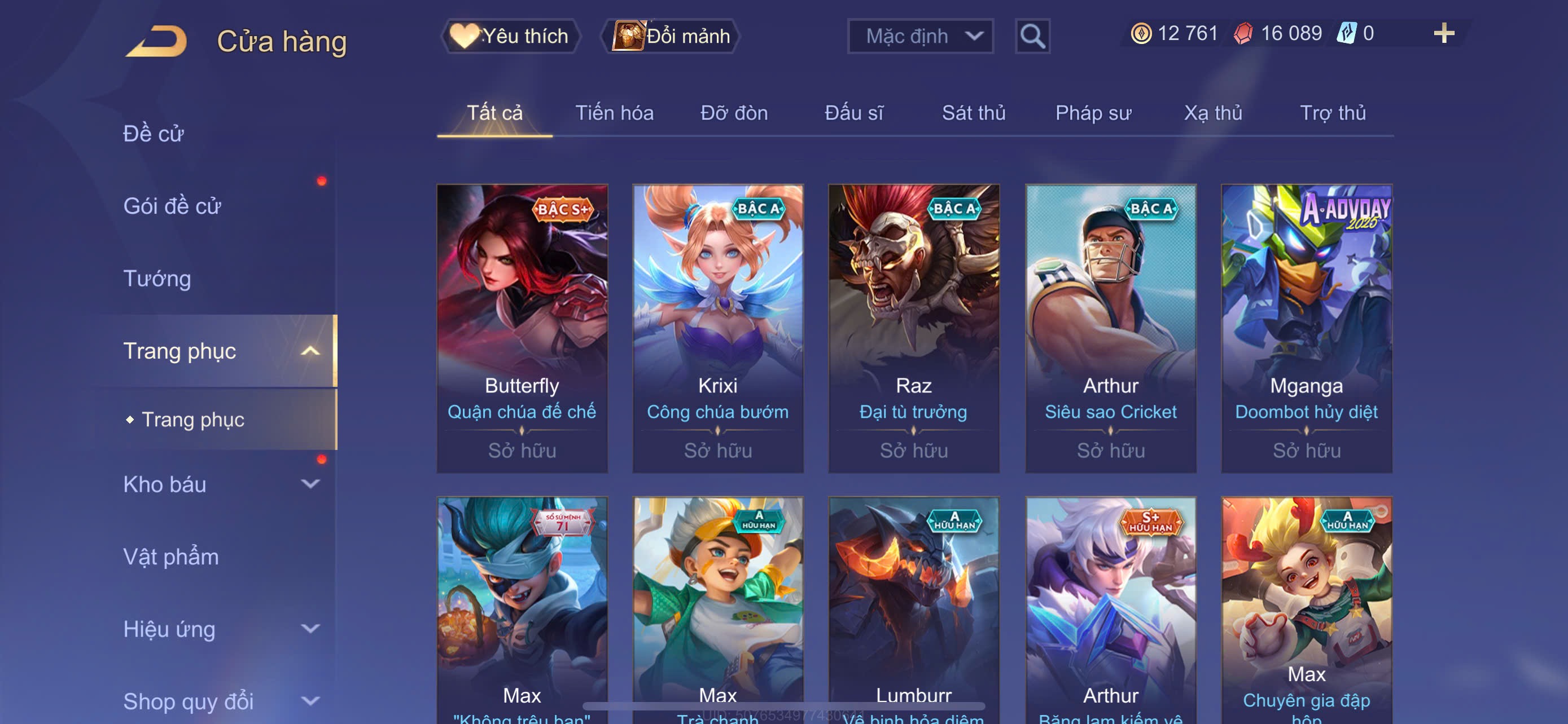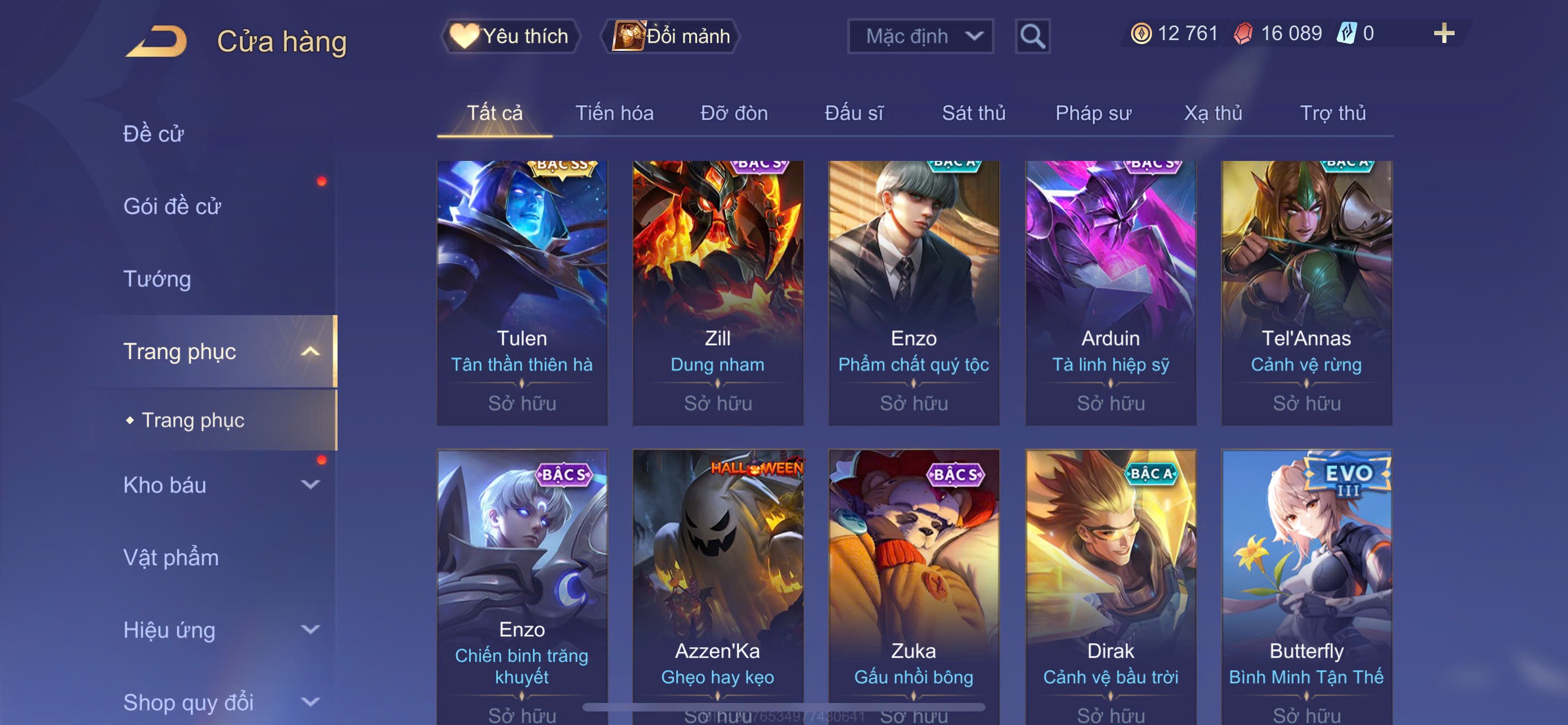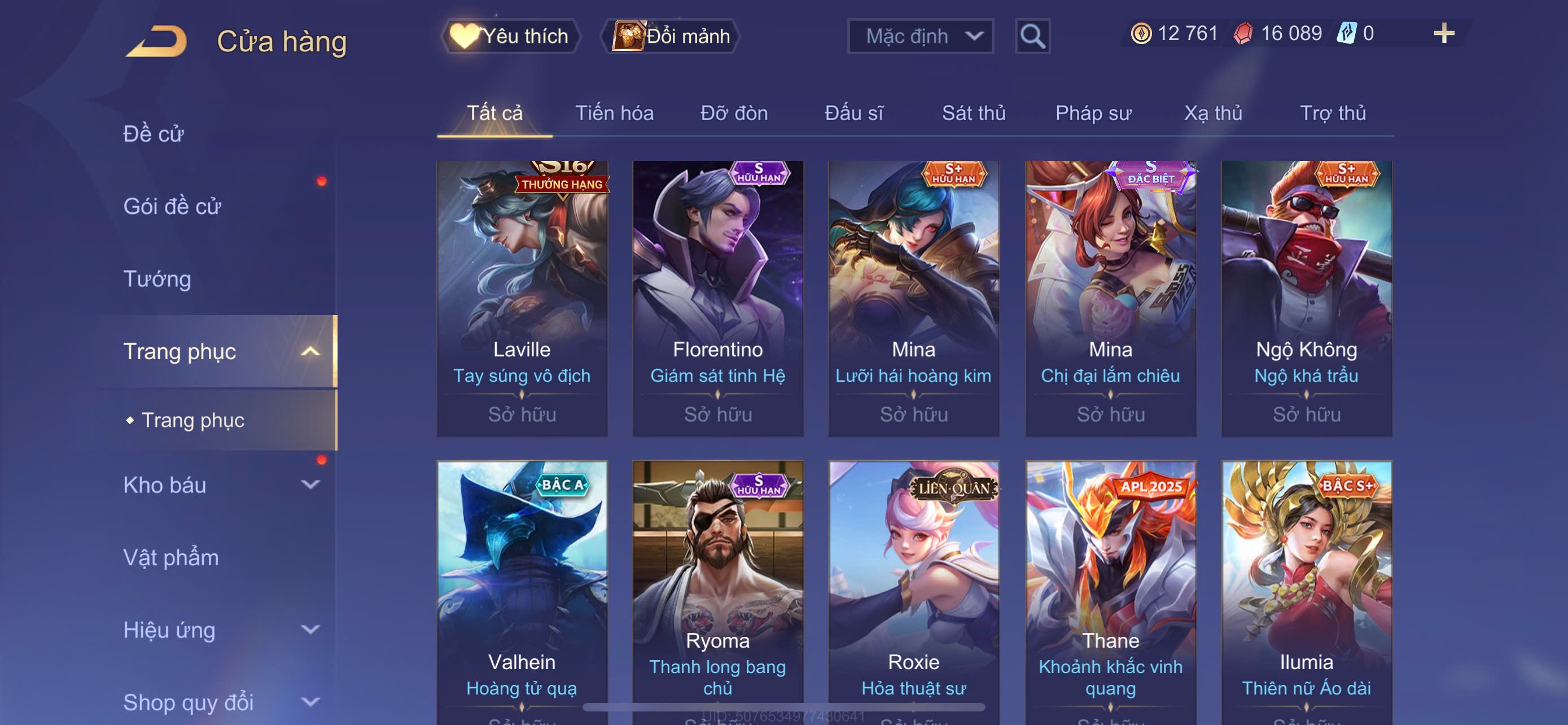 Nổi bật: Flo Tinh Hệ , Ryo Thanh Long , Tulen SS và nhiều skin khác . đủ thẻ đổi tên